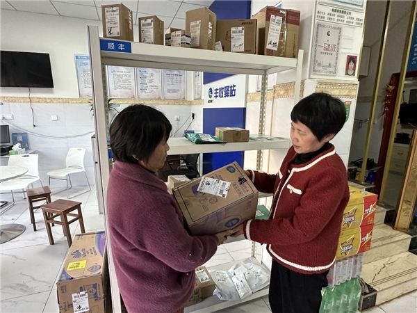 图为村民王大姐在胡金香店内拿取快递