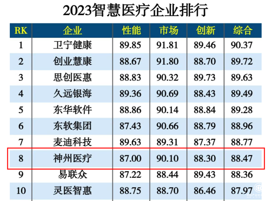 2023年8月24日,中国科学院《互联网周刊》、中国社会科学院信息化研究中心、德本咨询发布2023信创产业分类排行榜,神州医疗与多家上市公司共同入选“2023智慧医疗企业排行榜”,荣登第八位。