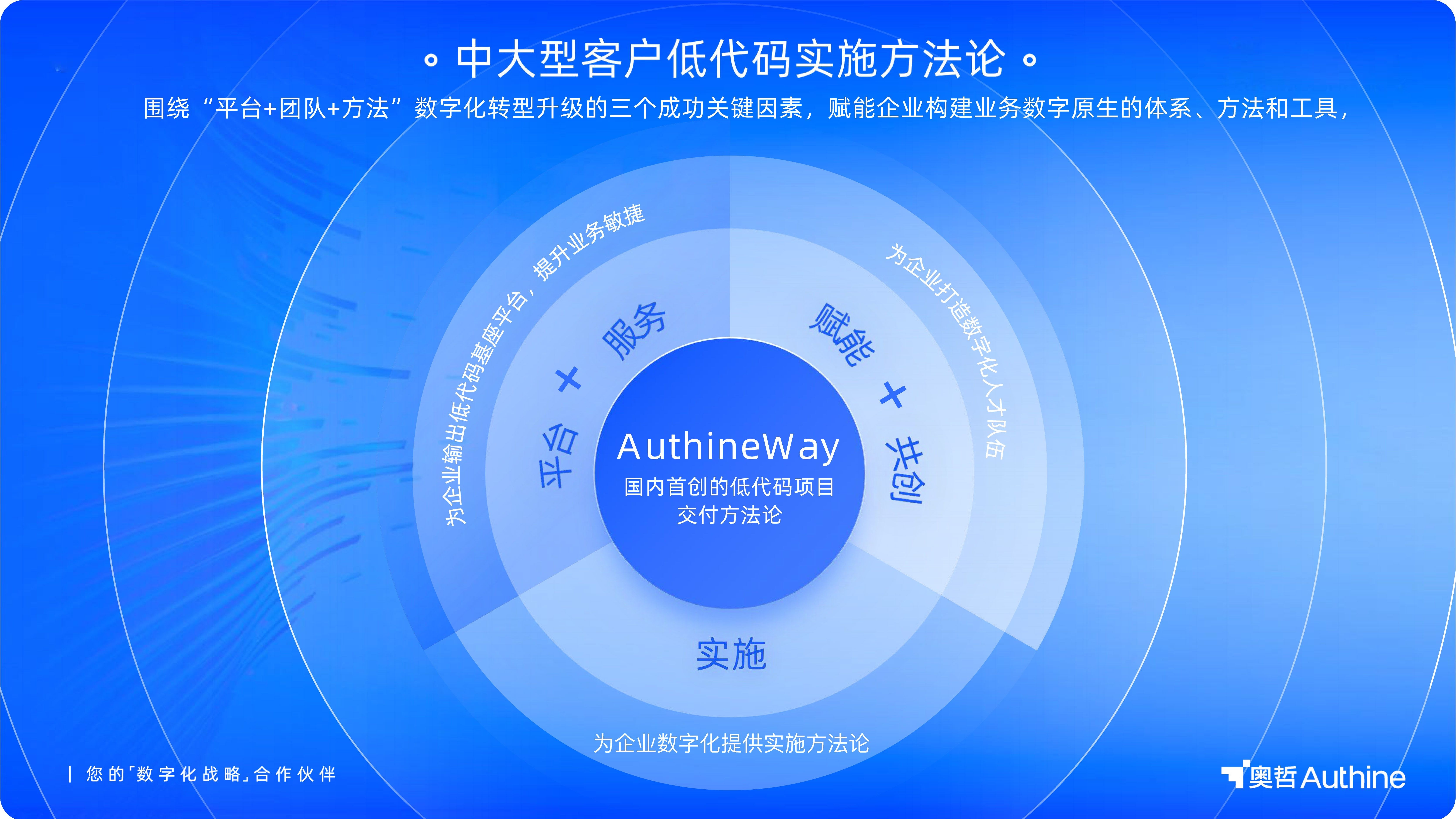 因此,AuthineWay方法论以共创和共融为核心理念,强调平台+服务的支撑模式,注重与企业原有技术资产的共生,以及推动技术和业务的相互赋能,为企业打造既懂业务又懂技术的复合型人才队伍。从组织、技术、方法多个层面推动企业数字化转型,帮助企业实现业务数字化、数字业务化的转型目标。