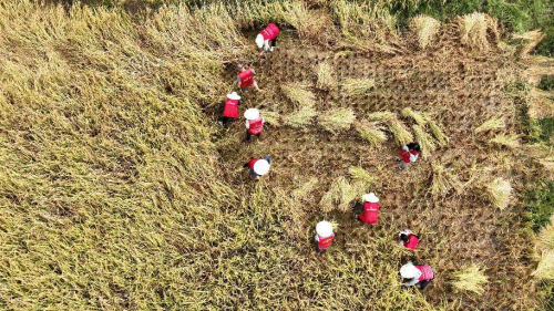 2023年10月20日,南平市烟草专卖局(公司)开展“齐心共耕希望田”党员志愿服务活动,图为志愿者金秋收割水稻。陈硕昊 摄