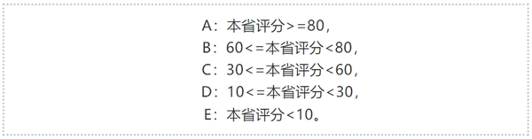 以云南省市为例,先粗略按照本省评分将测试数据车辆分成A、B、C、D、E五个风险等级,再分省、分地市对比建模前后每个等级的含NCD系数基准保费赔付率。其中,分类方法为: