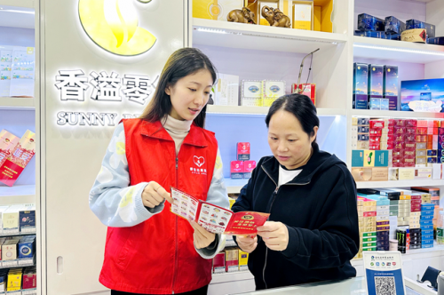 图为“香溢”志愿者在终端与零售客户共学消防知识