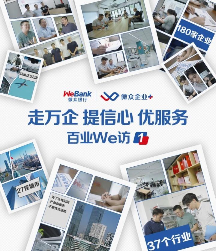 民营企业发展迈上新台阶。今年国家提到,金融机构要深入了解民营企业金融需求,建立健全与企业的常态化沟通交流机制,回应民营企业关切做好银企融资对接,为民营企业提供可靠、高效、便捷的金融服务,持续提升金融服务可得性和满意度。微众银行一直以来通过深入洞察企业服务需求,不断优化和完善金融产品及服务,提升金融服务能力。而面对国家鼓励的“大兴调查研究之风”等政策,微众银行企业金融品牌微众企业+积极落实“走万企 提信心 优服务”活动要求,充分结合日常业务的推进开启了“百业We访”调研行动,截至目前已累计走访27个城市、37个行业的180家企业,通过调研倾听企业的真实心声,了解企业家们的所需所想,并就企业所反馈的关于还款流程、App联动、界面优化等重点问题进行排查和优化,有效提高了企业对金融服务的满意度。