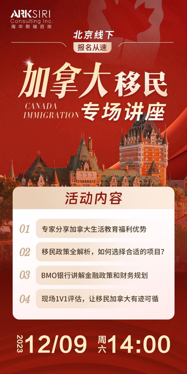 为响应这一全球趋势,海华熙瑞公司将于12月9日在北京举办题为“加拿大移民专题讲座”的活动,旨在为有意向移民加拿大的人士提供权威的政策解读和全方位的支持。