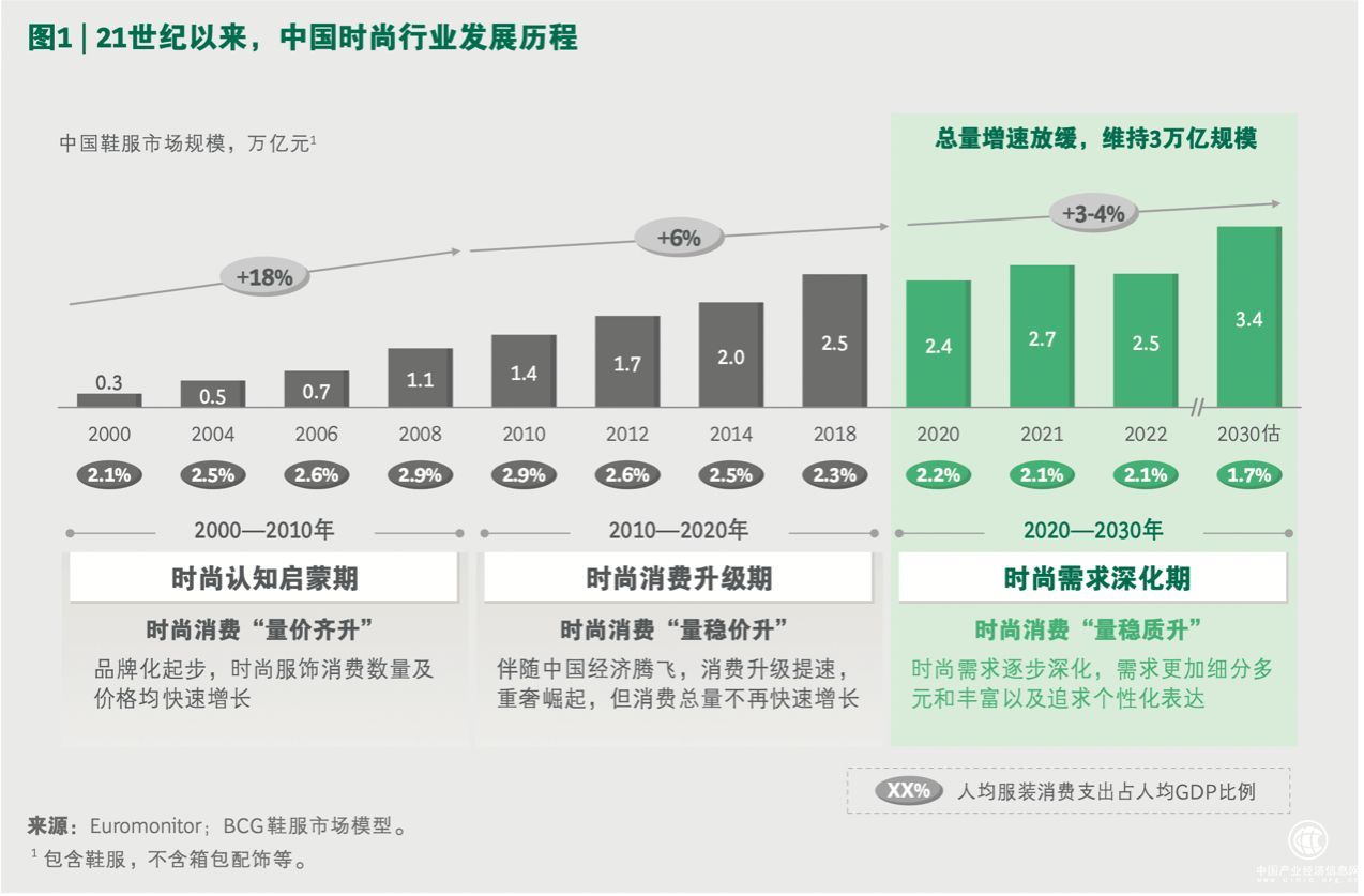 随着全行业链路的完备和消费者购买力的提高,中国时尚产业在过去二十年中以肉眼可见的速度向上攀登,不仅成为全球最大的奢侈品消费市场,更已跃升为全球最大单一鞋服消费市场,占比达到四分之一。据波士顿咨询公司(BCG)的报告,中国鞋服市场从2010年到2020年实现6%的复合增长,2020年市场规模达到2.4万亿元。中国时尚产业也在不断升级跃迁中逐渐形成兼具时代底色和自身产业特色的全新发展格局。