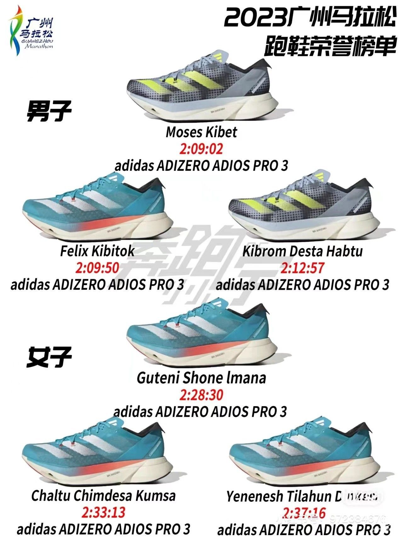值得一提的是,此次广州马拉松男女子组冠亚季军均选择了在业内有着“纪录粉碎机”之称的adidas ADIZERO ADIOS PRO 3跑鞋。