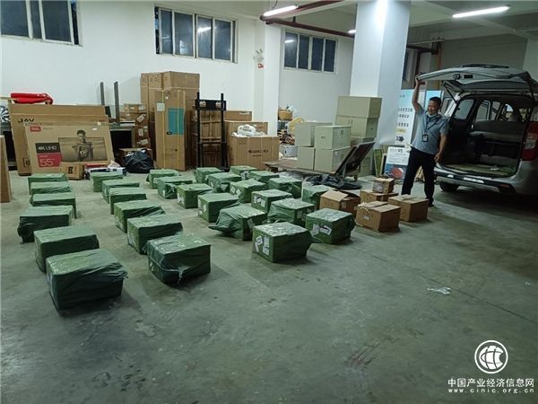 图为百色市靖西烟草专卖局联合执法部门查获首例非法入境电子烟案件现场清点涉案物品。(李文武/摄)