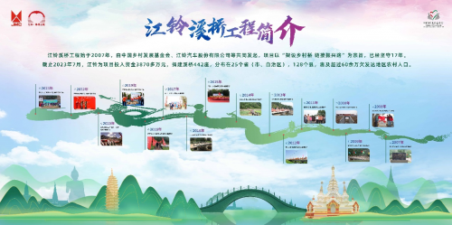 2007年4月,江铃汽车联合中国乡村发展基金会、中国汽车报社、中国汽车新闻工作者共同发起了“江铃·溪桥工程”公益项目,旨在为我国部分经济欠发达地区提供资金,援建便民桥,解决出行难。十几年过去了,截止目前,江铃汽车为项目投入资金3870多万元,“江铃溪桥”的足迹遍布全国25个省(市、自治区)的128个县,442座便民桥为60余万欠发达地区的人们架起了“希望”。