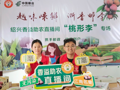图为嵊州市烟草专卖局“香溢”红色驿站店主与志愿者开展直播助农活动