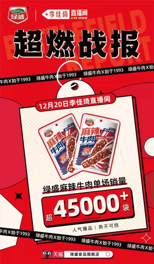 12月20日,绿盛麻辣牛肉首次上架李佳琦直播间,单场销量超45000+袋,好吃美味到连李佳琦都赞不绝口,连下4单,一度引爆直播间销售狂潮。(数据来源:生意参谋)
