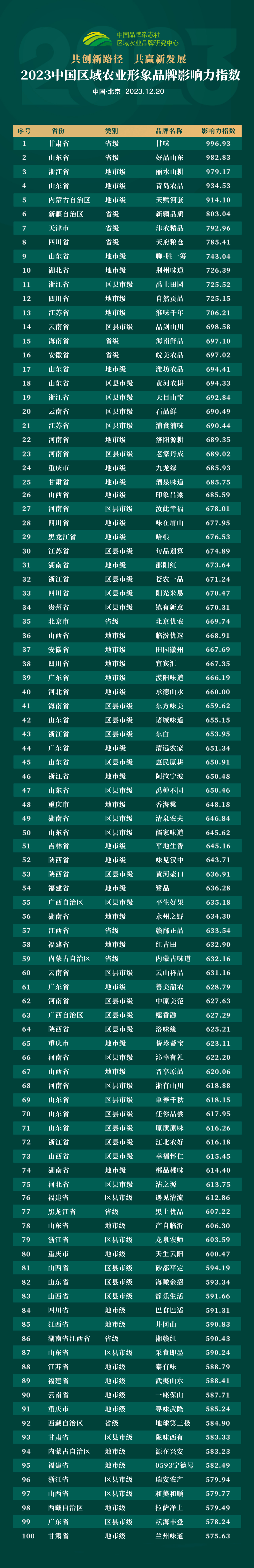“2023 中国区域农业产业品牌影响力指数”公布如下: