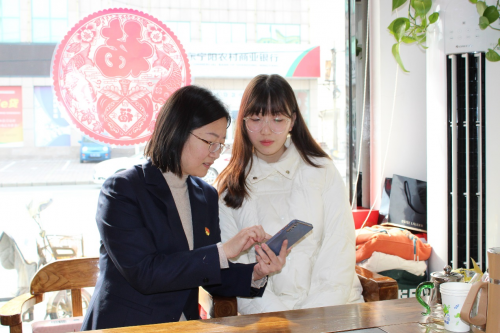 图为工作人员指导农村客户开通“泰e购”小程序,帮助搭建线上商城