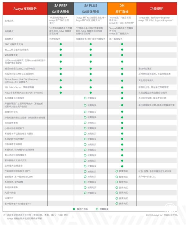 Avaya SA首选服务为全球客户提供了全面、可定制、一致的支持,可以通过先进的功能引入助力企业实现价值最大化。其中包括:通过Avaya专家系统(Avava EXPERTSystems) 实现的远程监控和主动问题解决方案;利用Avaya诊断服务器和SLAMon技术实现前所未有的网络可见度;多厂商支持协作,让Avaya全球支持服务团队能和指定厂商合作,跨混合环境诊断误操作问题,更迅速的隔根本原因。