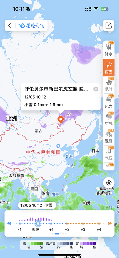 以墨迹天气近期上线的雨雪地图为例,既可以看到气象服务产品的专业度,又能发现其与用户群体极度适配的实用性。墨迹天气可以根据用户定位在雨雪地图上显示实时及未来48小时雨雪分布情况,帮助直观了解不同区域的降水情况,并且支持全球范围查询功能。