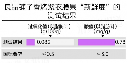 检测结果显示,良品铺子香烤紫衣腰果过氧化值实测值为0.082g/100g,酸价实测值为0.78mg/g,远远低于国标限值,新鲜程度很高,说明罐子里的腰果一直保持着“新鲜”的状态。