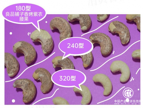 根据行业通用筛选标准,腰果按尺寸、形状和饱和度进行分级,数字来源于每磅腰果的数量,因此数字越小则颗粒越大。180型腰果指每磅中的数量约为180颗左右,腰果等级由高到低分别是180型>240型>320型>450型,良品铺子香烤紫衣腰果属于180型。