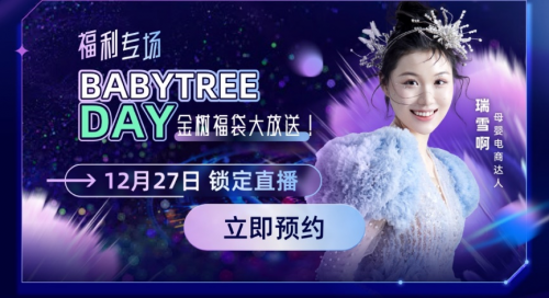 12月27日活动当天,宝宝树还将设置了“Babytree Day”官方直播活动,回馈宝宝树用户的信任和长期支持。宝宝树联合抖音头部母婴达人主播瑞雪啊,为用户带来专场直播福利,放送限量金树福袋。