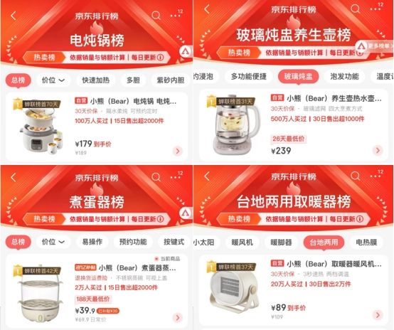 在小家电领域,小熊电器正凭借着精品优势,在“暖经济”热潮中“一路升温”。据京东数据显示,小熊电器多款产品位居京东热卖榜首,包括霸榜电炖锅榜、小容量养生壶榜、煮蛋器榜、台地两用取暖器榜等多榜TOP1,而且爆品销量快速攀升,成为这个冬天越来越多年轻人享受精致生活的首选。