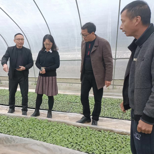 图为公司总经理吴玉泉察看烤烟湿润育苗基质、营养液使用情况。金明公司供图