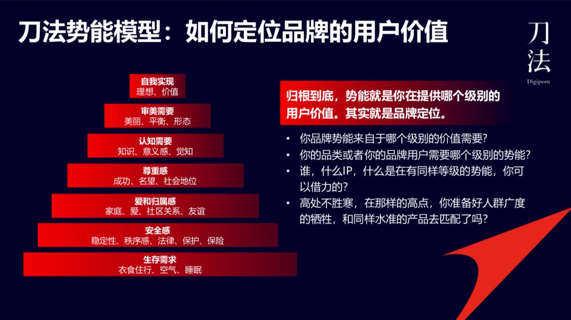 我们从刀姐doris 最新提出的动势能理论 4.0 中可以窥见原因。刀姐doris 以马斯洛需求层次为基础,将品牌价值分成 7 个层级,由下往上分别是生存需求、安全感、爱和归属感、尊重感、认知需要、审美需要、自我实现。而在目前的消费大环境下,安全感是消费者最主要的需求之一。这也是为什么很多品牌会选择做行业白皮书,并寻求登上行业权威榜单的机会。