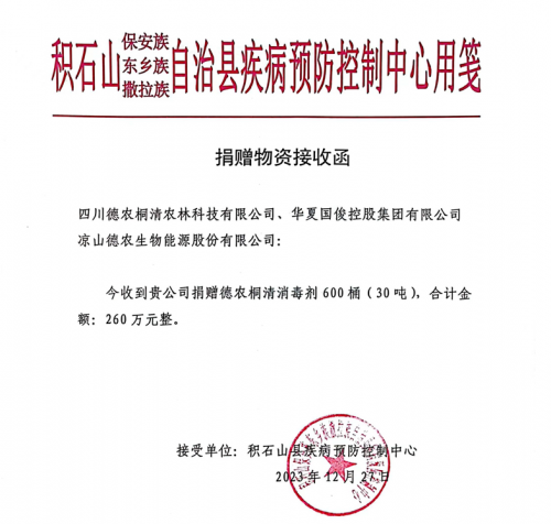 2023年12月19日甘肃省积石山县发生6.1级地震,牵动了全国人民的心,一批有责任担当的企业纷纷伸出友爱之手,2023年12月26,由四川德农桐清农林科技有限公司、凉山德农生物能源股份有限公司和华夏国俊控制集团有限公司捐赠,环球应急救援西部指挥中心和中管院崇高健康大舞台管理中心支持的德农桐清消毒剂30吨,价值260万元从成都市启程,运往甘肃省积石山县。此次捐赠的消毒剂无毒、无味、无刺激、无腐蚀,可杀灭流感病毒、金黄色葡萄球菌、大肠杆、铜绿假单胞菌和白色念珠菌等菌种,灭杀率达到99.999%,非常适合灾区的环境消杀。