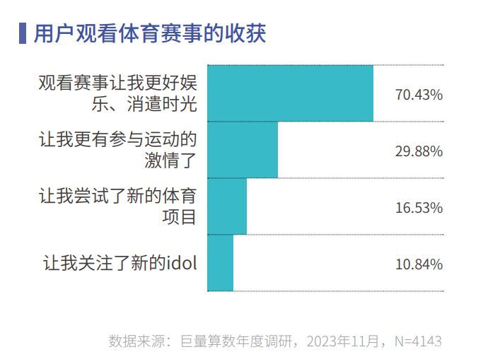 体育赛事带动全民运动,数字技术将“天边”的体育赛事带到了“眼前”,“小众”不再是壁垒。调研数据显示,70% 的用户通过在抖音观赛欢度休闲时光,而在一波一波运动热潮带动下,观众们的热情也在转化为行动。约有三成观众在运动中感受到了更多的运动热情,而他们中的一部分甚至因为观赛而向从未体验的新运动迈出第一步。