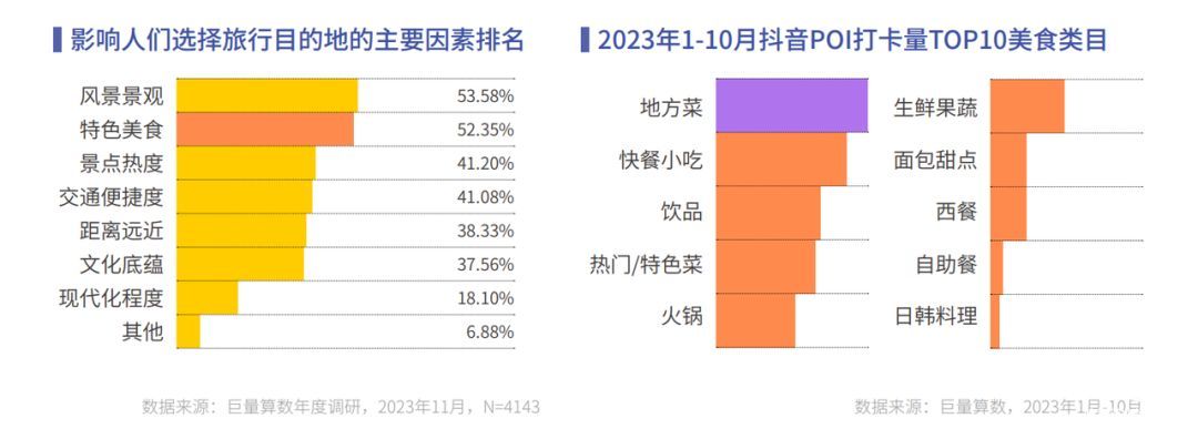 各地特色美食成为地方名片,吸引着庞大用户,影响着人们对于旅行目的地的选择。根据巨量算数调研数据,半数以上的人会把品尝特色美食作为旅行的重要目标。地方菜成为抖音美食打卡最受欢迎的品类。