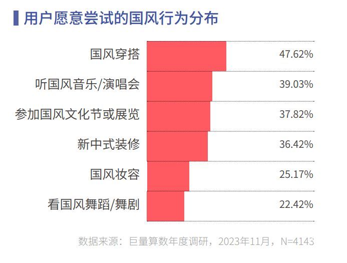 传统文化与现代元素的结合成为了受当代年轻人追捧的国潮。国风大兴不仅源于青年群体对传统文化的认同感,还与 2023 年各地纷纷举办线下国风文化节、展览等密切相关。尝试国风穿搭、听国风音乐会、打卡国风文化节成为年轻人新的休闲娱乐方式。