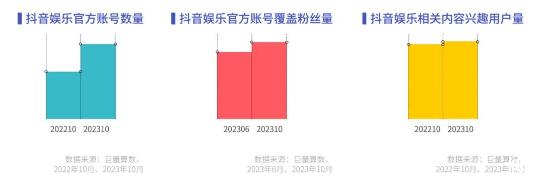 随着娱乐生活的复苏,越来越多影视综艺官方账号在抖音宣传他们的新作品,既剪辑精彩桥段,也与用户分享台前幕后的有趣故事。抖音逐渐成为宣发活动的重要阵地,改变了大众了解最新影视信息的方式。2023 年,影视综网络文娱官方账号数量增长率超过60%,其覆盖粉丝数量和兴趣用户也有一定增幅。