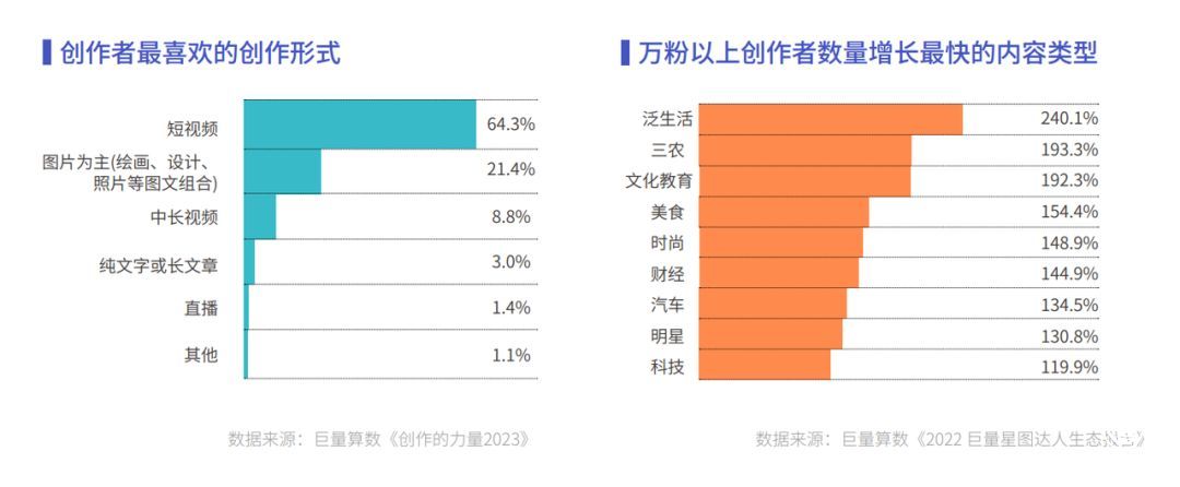瞬息万变的世界里,达人的创作也愈发多样。从形式上看,尽管短视频仍是主流,但图文、直播等形式占比已接近4成。从内容上看,达人兴趣总体标签数量增长 26.3%,生活、三农和文化教育类达人数量快速增长。无论是发表感想、分享生活还是陈述见解,各路达人总能让我们耳目一新。