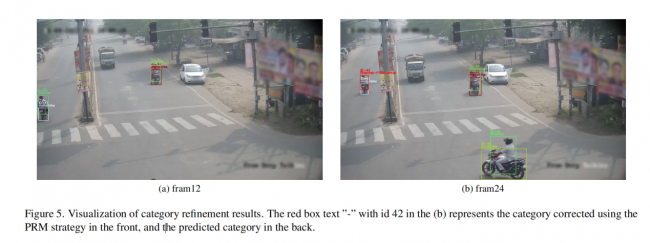 在视频中,我们发现随着非机动车辆驶出摄像头的视野,模型预测的标签会随着目标逐渐变小而改变。受到跟踪思想的启发,同一跟踪 ID 的相应框在运动过程中类别不应该发生改变。SORT [2] 是一种典型的基于检测的跟踪方法。我们通过SORT获得摩托车和行人的轨迹,计算该ID中所有帧的类别,当某个类别的频率超过给定跟踪ID的总检测次数的50%时,我们将该ID上所有帧均改为该类别标签。