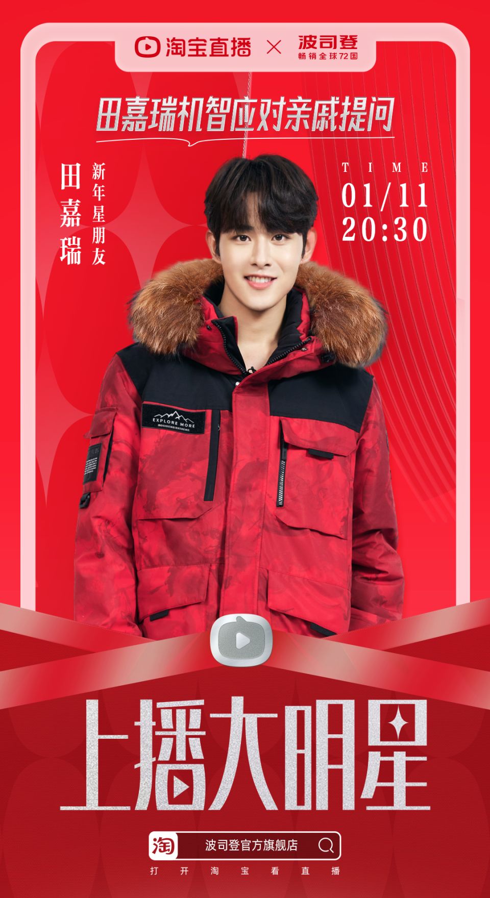 1月11日晚20:30,打开手机淘宝搜索波司登官方旗舰店,或锁定@淘宝直播 #上播大明星#,上天猫@聚划算 参与#聚划算欢聚日# ,近距离了解波司登新年联名系列,参与互动赢取丰厚奖品。