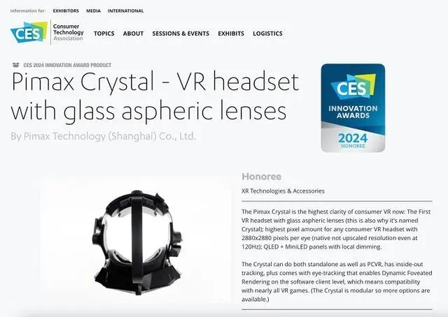 Pimax Crystal荣获CES 2024创新奖“XR技术与配件”类别的荣誉奖,成为唯一一款在这一类别中获奖的VR头显。Pimax Crystal也是XR类别中唯一一款实际上可以购买的头显产品。