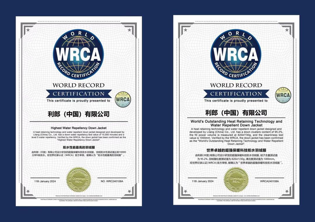 △利郎拒水羽绒获双项WRCA世界纪录官方认证