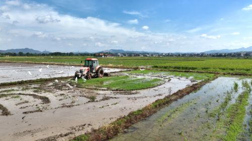 图为白鹭伴飞农机耕作的场景。罗晗彪摄