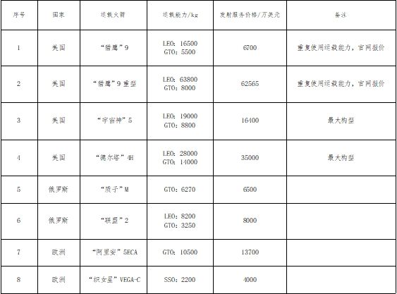 注:本表格数据来源于《中国航天》整理的中国长城工业集团有限公司和北京航天长征科技信息研究所,此外均选取各自火箭对应其发射场的最大运载能力进行分析。
