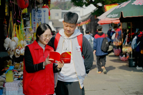 “《中华人民共和国宪法》第三十八条规定:中华人民共和国公民的人格尊严不受侵犯。禁止用任何方法对公民进行侮辱、诽谤和诬告陷害。”志愿者王喆正在东沙古镇向青少年讲解宪法相关知识。