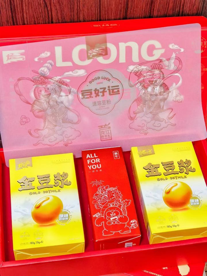 “豆好运”新春礼盒设计独具匠心,不仅包装精美,充满浓厚的中国风元素,更寓意着新年的好运连连、福气满满。礼盒中包含了多种口味的龙王豆浆产品,既有经典原味豆浆,也有满足不同消费者需求的创新口味,如金豆豆浆、黑豆豆浆等,旨在满足全家人在欢聚一堂时的不同口感需求。