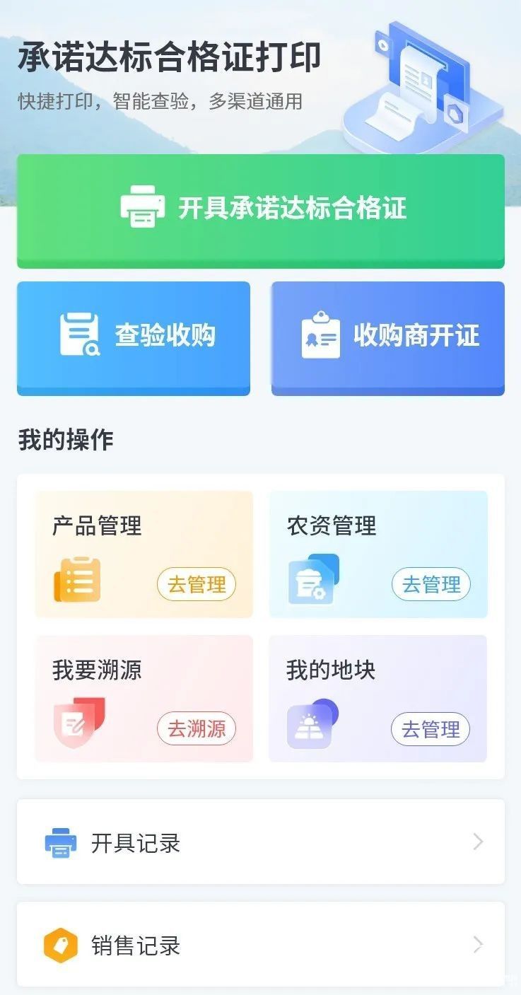 一体机合格证智能打印主要用于农业主体(企业、合作社、家庭农场、农户)小批量开具打印农产品承诺达标合格证场景。可以实现主体备案、农产品承诺达标合格证开具、合格证打印以及合格证开具统计等功能,为个体农户提供便捷申领农产品承诺达标合格证的极简流程。