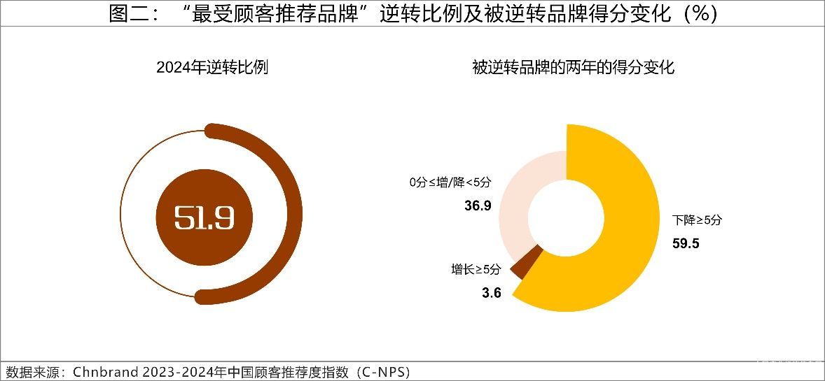 2024年“最受顾客推荐品牌”的逆转比例为51.9%,较上年度增加1.6%,C-NPS逆转比例仍然居于高位。