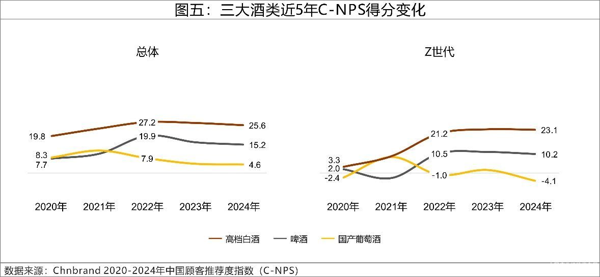 我们选择了三组具备共性的品类,第一组是酒类品类组,从数据中可以看到,近5年三大酒类的C-NPS表现出不同的发展趋势。高档白酒和啤酒品类均呈波动上升的发展态势,尤其是高档白酒在Z世代群体中的得分从2020年的3.3分提升至23.1分,而国产葡萄酒C-NPS得分持续下滑,消费者体验面临困境。