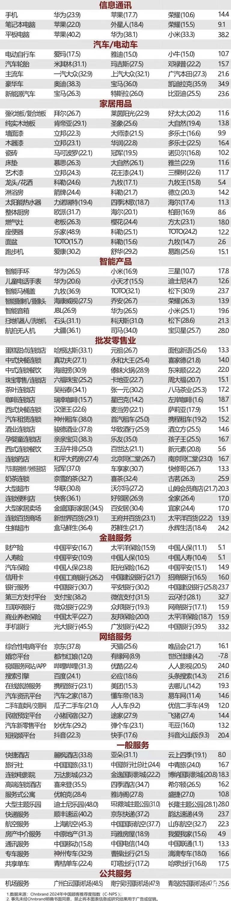 2024年C-NPS调查区域覆盖全国100+城市,调查对象为15岁到64岁之间的常住居民,并根据性别、年龄、收入进行随机抽样,总样本数量为2659000多个,采用线上调研的方式完成,覆盖163个细分行业,涉及被评价主流品牌10150余个。(尚文)