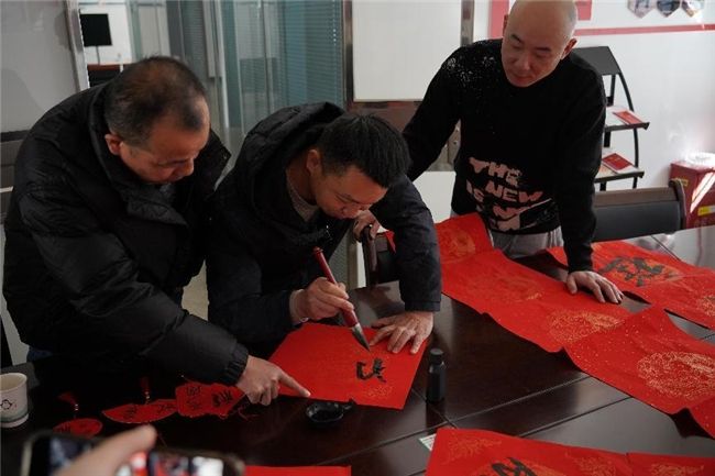 不会写毛笔字的,也忙碌着帮忙摆放纸张、抻对联,把写好的春联、福字摆好晾干,空气中似乎都洋溢着春节即将到来的喜庆气氛。