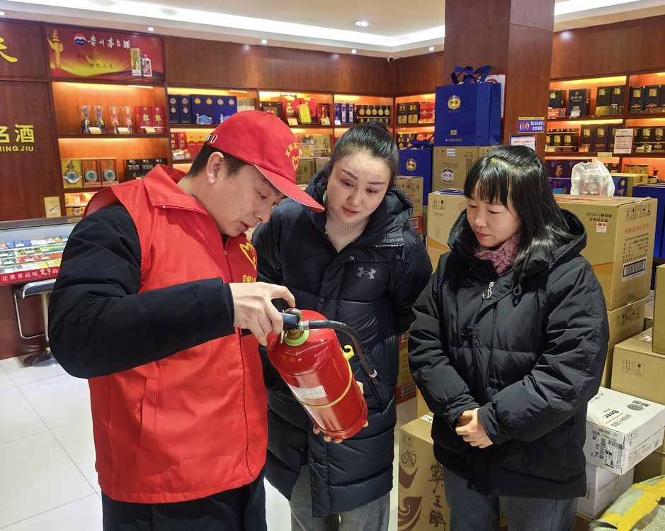 “王老板,春节即将来临,安全意识更要加强呀!”志愿服务队员张小飞一边说着一边帮助王老板检查着店内消防安全情况。
