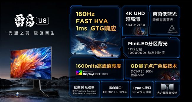 而作为第一款4K显示器的光耀之羽U8,同样标配MiniLED灯珠,棋盘式部署1152个分区。尽管都是配备的TCL华星光电最先进的HVA屏,跟Q8不一样的地方在于,U8是27英寸16:9的显示屏幕,4K UHD超高清的分辨率,加上QD量子点广色域技术和95%的DCI-P3色域值,色准也完美控制在了2以内,再结合1600nits的峰值亮度,这让U8在画面的清晰度和细腻度方面拥有了让人惊艳和过目难忘的表现,另外,雷鸟Q8还获得了潘通认证,也能轻松满足设计师专业办公的需求。从产品配置看,Q8的硬核性能可以称得上是满级选手。