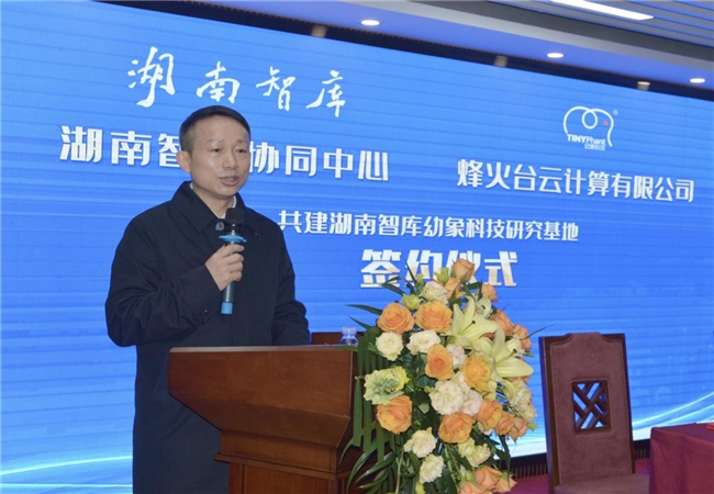 2月5日上午,湖南智库协同中心与烽火台云计算有限公司共建湖南智库幼象科技研究基地(课题组)签约仪式在长沙举行。湖南省人民检察院原检察长张树海,中共湖南省委统战部原副部长朱振基,国家发改委宏观经济管理专家委员会专家、研究员、湖南发展研究中心主任、博士智库基金管理委员会主席、湖南智库协同中心主任王超,湖南智库协同中心秘书长胡景祯,烽火台云计算有限公司副董事长周晚生,董事刘小琛等出席签约仪式。
