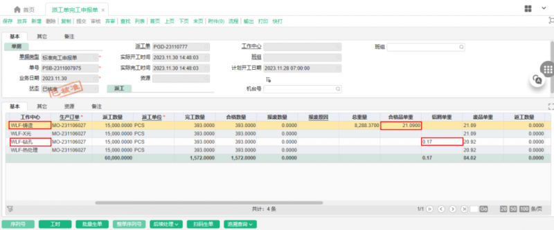 金属屑、回炉料之前都是不定期统一收集、称重后入账,在全产品上按重量比例进行分摊。这种核算处理方式对总成本统计没有影响,但是具体到品种上会导致和实际成本较大的差异,无法准确的知道哪款产品利润较高。通过在作业点增加实时重量采集的方式,可以及时、准确的获知每一个轮毂在不同工序的实际重量,倒算出在该工序产生的金属回收料重量,进行直接的成本扣减,改变原来统一分配的模式为实时准确归集。这样的处理方案,每年可为企业精准冲减成本4100万。