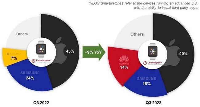 同时,根据Counterpoint最新报告显示,2023年Q3全球智能手表市场份额,华为手机出货量同比增长56%,以14%的市场份额位居全球第三。