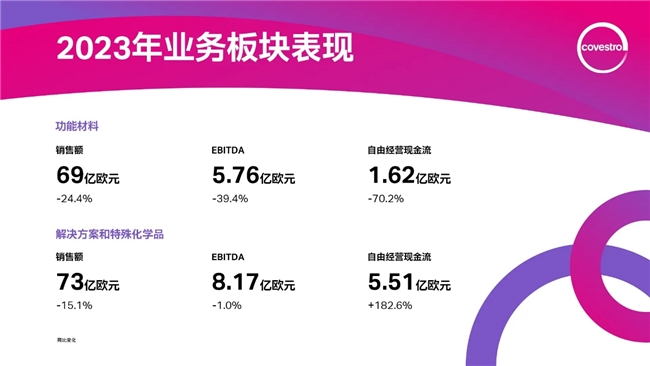 2023年第四季度,科思创的销售额同比下降15.6%至约33亿欧元(2022年同期:40亿欧元),这主要由该季度较低的销售价格水平造成。四季度EBITDA为1.32亿欧元(2022年同期:-3800万欧元),自由经营现金流则为7300万欧元(2022年同期:5.5亿欧元),两者均为正值。