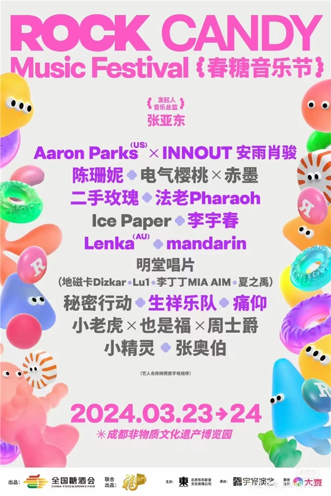 此外,3月23日至24日,“ROCK CANDY春糖音乐节”作为全国糖酒会的首次尝试,将与来蓉百万客商及观众,共同探索潮流及传统音乐的多元融合方式。国内、国外知名音乐人参演,流行、摇滚、嘻哈、爵士、电子等多种曲风汇聚,让不同种类、风格的表演在碰撞中产生出奇妙的效应,依托全国糖酒会的流量资源,确保音乐节的高品质呈现,倾力打造一场“好看、好听、好吃”的“三好”音乐盛宴,培育一个全新的国际级音乐节品牌。